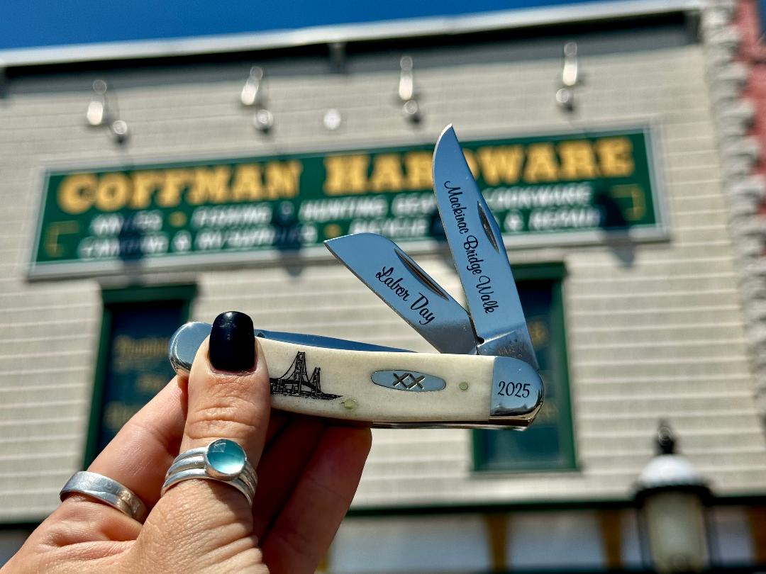 Our Mackinaw Bridge Walk knives are in for the 2025 season, stop in or call to get your hands on one (or two). Our Natural Bone Sowbelly is $110.99, an additional $7.00 for shipping.